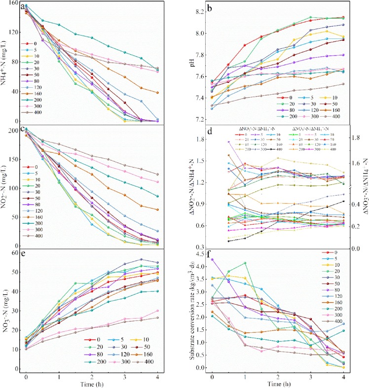 如圖3d所示,ΔNO2–N/ΔNH4+-N 和ΔNO3–N/ΔNH4+-N在前2小時(shí)出現(xiàn)不規(guī)則波動(dòng),然后趨于穩(wěn)定。然而,在300-400 mg/L時(shí),ΔNO2–N/ΔNH4+-N顯著偏離1.32,這與0-50 mg/L時(shí)的情況相反。隨著磷酸鹽濃度的增加,出水pH升高的幅度逐漸變平(圖3b),例如400 mg/L時(shí),ΔpH值僅占不添加磷酸鹽時(shí)的33%。如圖3f所示,隨著反應(yīng)時(shí)間的延長(zhǎng),底物轉(zhuǎn)化率逐漸降低,在160-400 mg/L階段,由于磷酸鹽沉積物的存在,底物與生物質(zhì)之間的接觸受到阻礙,導(dǎo)致底物轉(zhuǎn)化率較低。因此,在高濃度磷酸鹽的存在下,SBR 中MAB的活性會(huì)嚴(yán)重惡化。