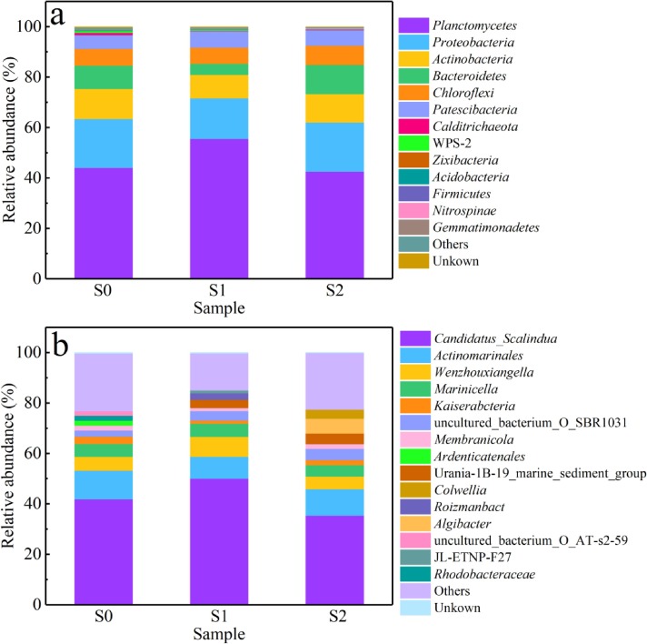 通過(guò)16S rRNA研究了不同磷酸鹽濃度下SBR中微生物群落的變化。三個(gè)時(shí)間的微生物樣品的OTU數(shù)量分別為311、300和297,圖4a揭示了SBR中的主要微生物:Planctomycetes、Proteobacteria、Actinobacteria、Bacteroidetes和Chloroflexi。其中,含有厭氧氨氧化菌屬的Planctomycetes仍處于優(yōu)勢(shì)地位,添加磷酸鹽后,S1中的Planctomycetes從初始的44.11%加至55.6%,然后在S2中下降至42.61%,屬水平上同樣。此外,Proteobacteria、Actinobacteria、Bacteroidetes和Chloroflexi的豐富度均由S0的19.36%、11.95%、9.3%和6.53%下降到S1的16.09%、9.31%、4.38%和6.37%,然后上升到S2的19.53%、11.18%、11.59% 和 7.68%。這表明上述4個(gè)門(mén)與Planctomycetes存在競(jìng)爭(zhēng)關(guān)系,且Planctomycetes是含鹽廢水中的優(yōu)勢(shì)菌種。