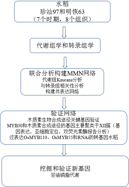 該研究利用代謝組和轉(zhuǎn)錄組聯(lián)合分析,對(duì)秈稻品種珍汕97和明恢63整個(gè)生命周期不同組織的樣品進(jìn)行測(cè)定,結(jié)合轉(zhuǎn)錄和代謝數(shù)據(jù)構(gòu)建了水稻全生育期主要組織器官的代謝調(diào)控網(wǎng)絡(luò)(RMRN)并精準(zhǔn)識(shí)別了調(diào)節(jié)關(guān)鍵代謝產(chǎn)物積累的調(diào)控基因,利用已知的轉(zhuǎn)錄因子作為誘餌來(lái)篩選木質(zhì)素代謝新的調(diào)控網(wǎng)絡(luò),以及根據(jù)組織特異性無(wú)偏見(jiàn)地識(shí)別新的甘油磷脂代謝調(diào)控因子。該研究不僅對(duì)水稻基礎(chǔ)研究和育種實(shí)踐具有重要意義,大數(shù)據(jù)資源促進(jìn)水稻生長(zhǎng)調(diào)控、抗性和營(yíng)養(yǎng)品質(zhì)方面的改良研究。并對(duì)其他作物全生育期代謝組學(xué)研究提供借鑒。