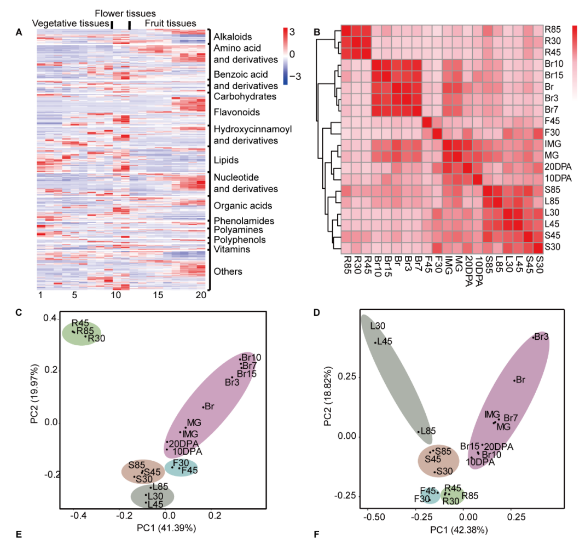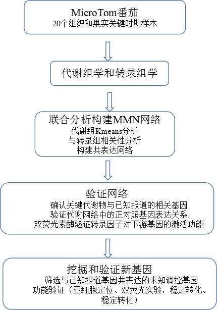 利用番茄代謝組和轉(zhuǎn)錄組數(shù)據(jù)集,通過(guò)整合番茄20個(gè)組織和發(fā)育時(shí)期的代謝組和轉(zhuǎn)錄組數(shù)據(jù),繪制了番茄整個(gè)生長(zhǎng)發(fā)育過(guò)程中主要代謝變化的整體圖譜,同時(shí)還發(fā)現(xiàn)調(diào)節(jié)重要次級(jí)代謝產(chǎn)物(類黃酮和甾體類生物堿)合成的關(guān)鍵調(diào)控因子,為深入解析番茄主要代謝物的轉(zhuǎn)錄調(diào)控網(wǎng)絡(luò)奠定了基礎(chǔ),并為模式和非模式植物代謝調(diào)控的深入研究提供了新思路。