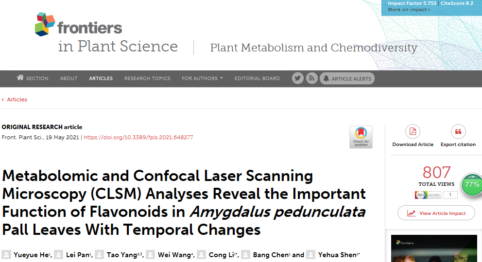 中文題目:代謝組學(xué)和激光共聚焦顯微鏡(CLSM)分析揭示長(zhǎng)柄扁桃葉生長(zhǎng)過(guò)程中黃酮類化合物的重要作用