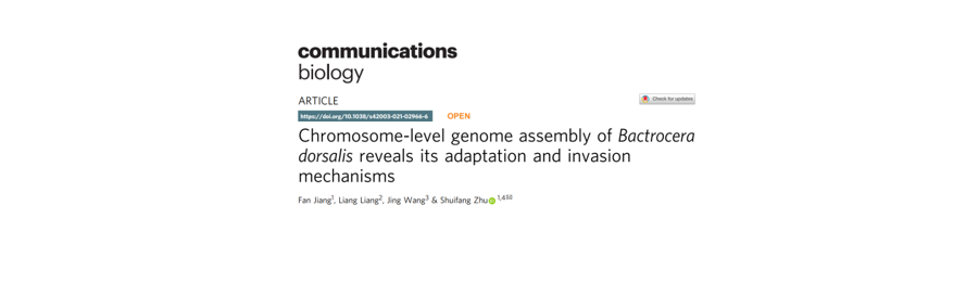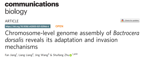 2022年1月11日,Nature子刊Communications Biology在線發(fā)表了中國(guó)檢科院首席科學(xué)家朱水芳科研團(tuán)隊(duì)領(lǐng)銜完成的研究論文“Chromosome-level genome assembly of Bactrocera dorsalis reveals its adaptation and invasion mechanisms”。該研究報(bào)道了橘小實(shí)蠅染色體水平基因組,并從多個(gè)角度揭示了橘小實(shí)蠅在全球入侵過(guò)程中的環(huán)境適應(yīng)性及其復(fù)合體種類豐富的分子機(jī)制,為橘小實(shí)蠅的入侵防控提供了新思路與新方法。百邁客有幸作為共同作者參與本項(xiàng)研究。