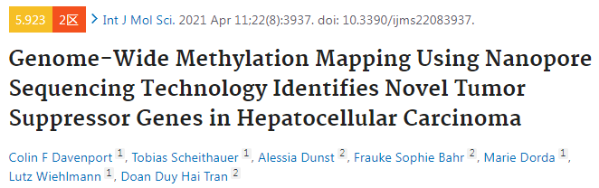 Davenport CF, Scheithauer T, Dunst A, et al. Genome-Wide Methylation Mapping Using Nanopore Sequencing Technology Identifies Novel Tumor Suppressor Genes in Hepatocellular Carcinoma. Int J Mol Sci. 2021;22(8):3937. Published 2021 Apr 11. doi:10.3390/ijms22083937