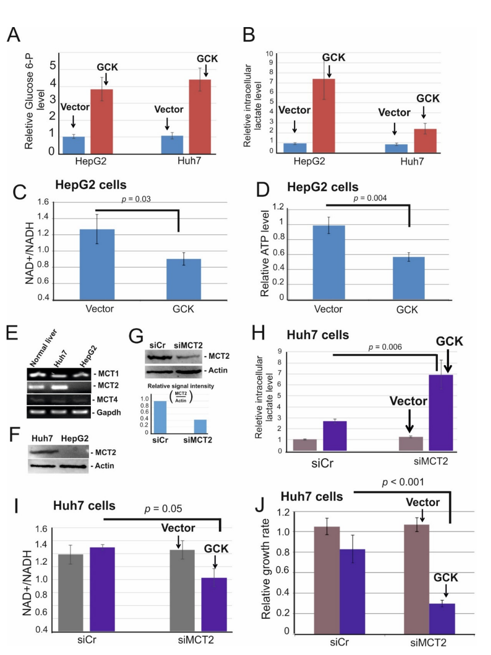 由于GCK過(guò)表達(dá)并未強(qiáng)烈誘導(dǎo)Huh7細(xì)胞中的乳酸積累,這就提出了乳酸是如何在這些細(xì)胞中外排的問(wèn)題。乳酸外排由雙向單羧酸轉(zhuǎn)運(yùn)體(MCTs)介導(dǎo),已知有四種MCT可轉(zhuǎn)運(yùn)乳酸,因此檢測(cè)了在 Huh7 和 HepG2 細(xì)胞中MCT變異體的表達(dá)。有趣的是,HepG2細(xì)胞僅表達(dá)MCT1和MCT4,而Huh7 細(xì)胞表達(dá)了三種變異體(圖4E)。還通過(guò)免疫印跡雜交實(shí)驗(yàn)證實(shí)了HepG2 細(xì)胞中缺乏 MCT2的表達(dá)(圖4F)。這些數(shù)據(jù)提出了隨后的問(wèn)題,即細(xì)胞內(nèi)乳酸積累是否由于HepG2細(xì)胞中缺乏MCT2所致。為了檢驗(yàn)這種可能性,耗盡了GCK過(guò)表達(dá)的Huh7細(xì)胞中的MCT2(圖4G) 并檢測(cè)了細(xì)胞內(nèi)乳酸的濃度。事實(shí)上,MCT2 的消耗顯著誘導(dǎo)了乳酸的積累(圖4H)。因此,在MCT2耗盡的細(xì)胞中,NAD+/NADH 比率顯著下降(圖4I) 并伴隨細(xì)胞增殖的減少(圖4J)??傊?,這些數(shù)據(jù)表明MCT2的缺乏在GCK過(guò)表達(dá)的細(xì)胞中顯著積累了乳酸。
