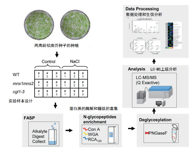 在植物中,N-糖基化參與許多生物過程,包括類固醇激素受體的?ER?質(zhì)量控制、配子體識(shí)別,?亞細(xì)胞轉(zhuǎn)運(yùn),?植物先天免疫?和氣孔發(fā)育等,主要是通過調(diào)節(jié)底物蛋白的穩(wěn)定性、功能或亞定位實(shí)現(xiàn)調(diào)控過程。此外研究發(fā)現(xiàn)復(fù)雜的N-聚糖生物合成失敗會(huì)導(dǎo)致擬南芥幼苗對(duì)鹽敏感,但對(duì)其潛在的分子機(jī)制仍知之甚少。本文利用納升流液相色譜串聯(lián)質(zhì)譜?(nanoLC-MS/MS)?技術(shù)進(jìn)行了無標(biāo)記蛋白質(zhì)組學(xué)分析,比較分析了野生型?(WT)?和兩個(gè)抗鹽脅迫的突變體的蛋白質(zhì)組差異。