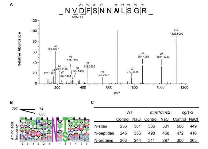 許多證據(jù)表明,植物對(duì)鹽脅迫的適應(yīng)性反應(yīng)需要相關(guān)蛋白上加工成熟的N-聚糖參與。然而,關(guān)于在這個(gè)過程中起作用的鹽響應(yīng)糖蛋白知之甚少。本研究鑒定了野生型?(WT)擬南芥中的鹽響應(yīng)糖蛋白和兩個(gè)N-聚糖成熟缺陷的突變體mns1?mns2和cgl1。通過液相色譜串聯(lián)質(zhì)譜?(LC-MS/MS)?進(jìn)行定量分析,共鑒定出97種豐度變化?>?1.5?的蛋白質(zhì)對(duì)抗鹽脅迫。表明N-聚糖對(duì)于調(diào)節(jié)應(yīng)激反應(yīng)蛋白水平至關(guān)重要,并且列出了幾種負(fù)責(zé)擬南芥耐鹽脅迫的新型糖蛋白。