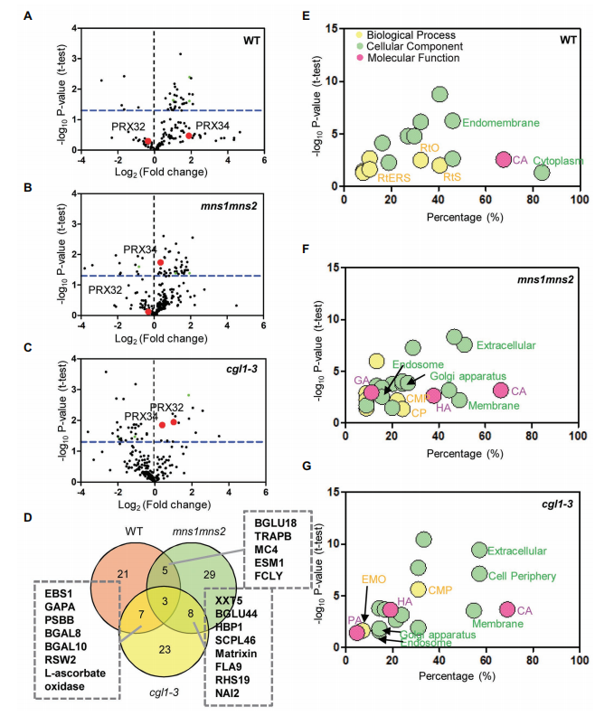 文中進(jìn)一步分析了鹽脅迫下DAG在GO注釋和KEGG代謝途徑中的生物學(xué)功能。在兩個(gè)突變體中觀察到更多減少的糖蛋白,尤其是在cgl1-3中(圖2?A–C)。值得注意的是,與?WT?相比,?mns1?mns2和cgl1-3突變體中的水解酶均得到富集(圖2?D–F)。在鹽脅迫下,WT和兩個(gè)參與內(nèi)質(zhì)網(wǎng)聚糖鏈轉(zhuǎn)移的突變體中?STT3A(OST亞基)、紫色酸性磷酸酶?2(PAP2)和類胚蛋白10(GLP10)的豐度發(fā)生了變化,這些蛋白分別參與了根系生長(zhǎng)和碳代謝(圖2?D)。STT3A在?WT中增加,但在mns1?mns2和cgl1-3中減少;PAP2?在?WT?和mns1mns2中增加,但在cgl1-3中減少,并且GLP10在所有三個(gè)樣本中都增加。進(jìn)一步的分子功能分析發(fā)現(xiàn),與WT相比,水解酶活性在mns1?mns2和cgl1-3中富集(圖2?E,G)。WT中鑒定的蛋白質(zhì)的生物學(xué)過程多與應(yīng)激反應(yīng)相關(guān),而來自突變體的大多數(shù)DAG與碳水化合物代謝過程有關(guān)(圖3?G)。這些結(jié)果表明,mns1?mns2和cgl1-3突變體中的鹽響應(yīng)糖蛋白不能正確響應(yīng)壓力,這可能是由于缺乏正確的N-聚糖修飾,導(dǎo)致它們的亞細(xì)胞定位異常。