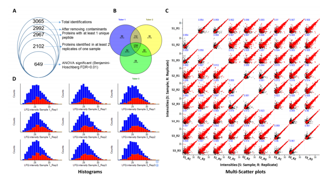 維恩圖分析顯示1702個(gè)蛋白質(zhì)組通常在所有三個(gè)塊莖樣品中鑒定,而89、36和54個(gè)蛋白質(zhì)組分別僅在塊莖?1、2和3中鑒定。此外,塊莖?1?和塊莖?2?共有?112?個(gè)蛋白質(zhì)組,表明它們的蛋白質(zhì)組與塊莖對(duì)?(2,3)?和?(3,1)?相比更密切相關(guān)(圖1?B)。為了檢查同一樣品一式三份中無標(biāo)記蛋白質(zhì)定量的重現(xiàn)性,使用?Perseus軟件生成多散點(diǎn)圖(圖1?C)。相同樣本的散點(diǎn)圖顯示出典型的非均勻分布,即在較低強(qiáng)度時(shí)較寬,在較高強(qiáng)度時(shí)指向較高。同一樣品的不同重復(fù)的皮爾遜相關(guān)系數(shù)大于0.944,表明同一樣品的三次重復(fù)之間具有高度相關(guān)性。直方圖顯示了缺失值插補(bǔ)前后的蛋白質(zhì)計(jì)數(shù)?(圖1?D)。
