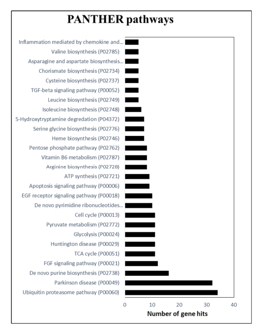 統(tǒng)計(jì)分析后,作者進(jìn)行基于基因本體(GO)的功能分類,在2102種蛋白質(zhì)中,PANTHER?19.0?針對(duì)Helianthus?annus數(shù)據(jù)庫檢測(cè)到2044種蛋白質(zhì)。接下來,進(jìn)行?PANTHER?通路分析以對(duì)蛋白質(zhì)通路進(jìn)行分類,發(fā)現(xiàn)了大多數(shù)蛋白質(zhì)歸因于泛素蛋白體和核苷酸(嘌呤)生物合成途徑,其次是TCA循環(huán)、糖酵解、丙酮酸代謝、細(xì)胞周期和嘧啶核糖核苷酸途徑。