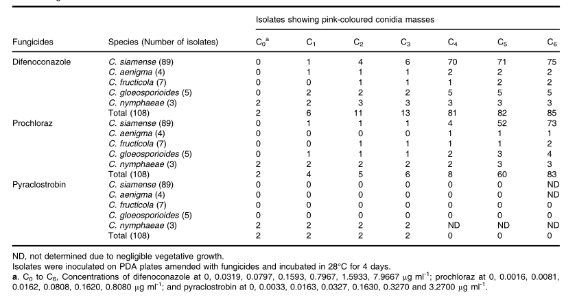 4、從5種炭疽菌中選取20個代表性菌株評估殺菌劑脅迫對分生孢子產(chǎn)量的影響:包括 5個C. siamense, 4個C.?gloeosporioides, 4個C. fructicola, 4個C. aenigma和3個C. nymphaeae。