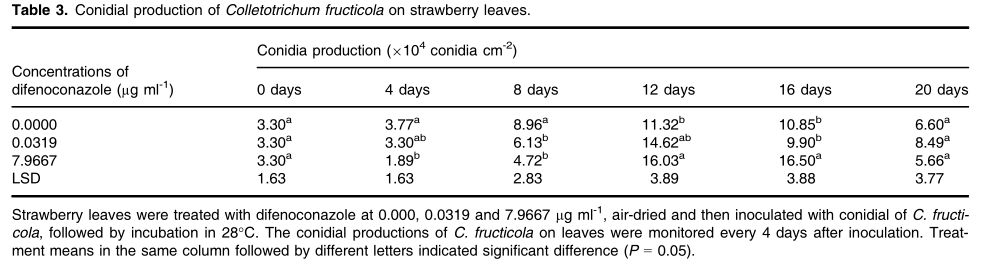 5、DMI對炭疽菌在植株組織上產(chǎn)孢的影響:用C. fructicola?菌株Gwha-1接種不同濃度苯醚甲環(huán)唑處理的草莓葉片,分析植物組織上分生孢子數(shù)量的變化趨勢。