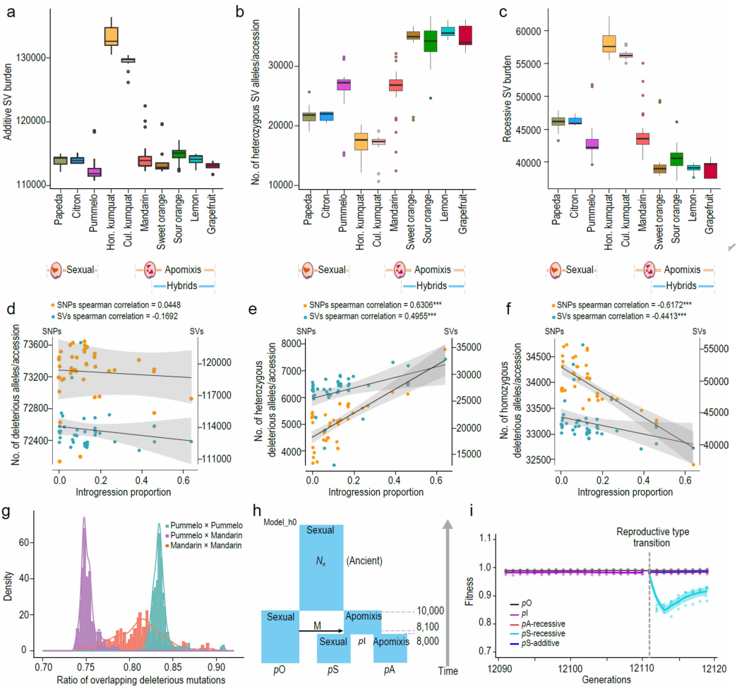 柑橘通過(guò)珠心進(jìn)行無(wú)融合生殖,保留了母體基因型,這可能導(dǎo)致基因組中有害突變和結(jié)構(gòu)變異(SVs)的積累。從234份材料中共鑒定出139,241個(gè)可靠的SVs,其中64.2%為缺失,16.6%為重復(fù),15.5%為易位。山金柑的SV數(shù)量最高,可能與有效種群大小減少有關(guān)(圖3a)。具有無(wú)融合生殖的雜交群體的雜合有害變異約為有性生殖群體的1.45倍。隨后提出了雜種無(wú)融合生殖將SVs隱藏在雜合子狀態(tài)的假說(shuō),這可能主要是隱性選擇造成的危害。因此,有性生殖的雜種可能會(huì)迅速以隱性純合的方式暴露有害變異。這個(gè)假說(shuō)解釋了為什么無(wú)融合生殖和有性生殖的天然雜交樣本中觀察到的自然雜種通常是無(wú)融合生殖的。有害突變的模式與SVs的模式一致,即與有性生殖群體相比,無(wú)融合生殖群體的隱性有害負(fù)擔(dān)較低(7.39%),雜合子SVs較多(約2.62倍)。在隱性模型下,從無(wú)融合生殖到有性生殖的生殖模式轉(zhuǎn)變導(dǎo)致種群適應(yīng)度在轉(zhuǎn)變后立即下降13.48±0.87%,但隨后恢復(fù)(圖3i)。相比之下,保持無(wú)融合生殖的種群保持種群適合度。
