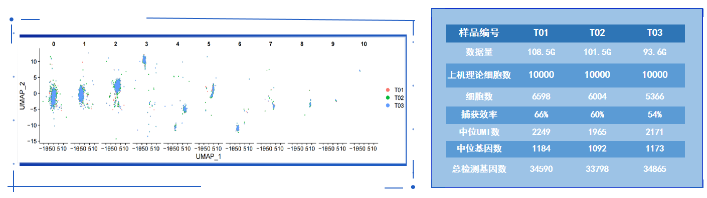 PBMC重復(fù)性檢測(cè):將相同的PBMC細(xì)胞懸液分3份,通過(guò)3個(gè)不同實(shí)驗(yàn)人員,用3臺(tái)百創(chuàng)DG1000儀器,獨(dú)立進(jìn)行單細(xì)胞測(cè)序,得到了幾乎一致的細(xì)胞聚類(lèi)分群結(jié)果,證明百創(chuàng)DG1000具有很好的可重復(fù)性及穩(wěn)定性(圖5)。