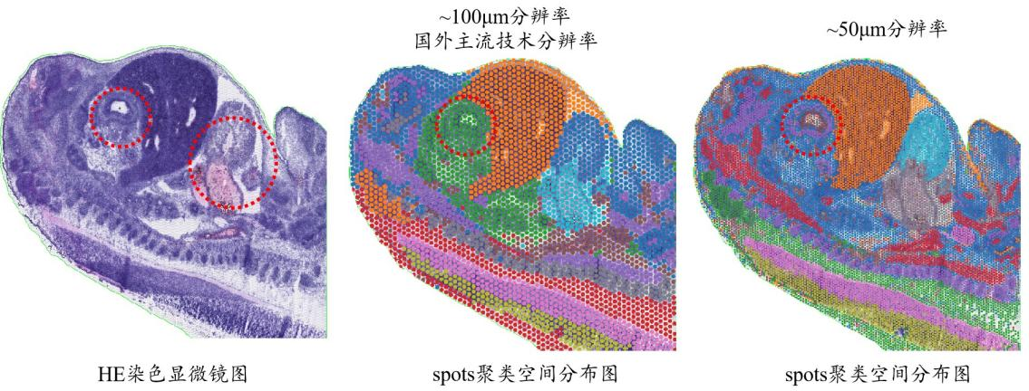 大鼠胚胎亞細(xì)胞分辨率實(shí)測(cè)數(shù)據(jù)展示:與100μm分辨率(主流技術(shù)平臺(tái))對(duì)比,高分辨率(~50μm)下HE染色組織形態(tài)學(xué)與spots聚類(lèi)空間分布圖重合度更高,精準(zhǔn)識(shí)別空間基因表達(dá)的異質(zhì)性和組織區(qū)域的特異性(圖7)。