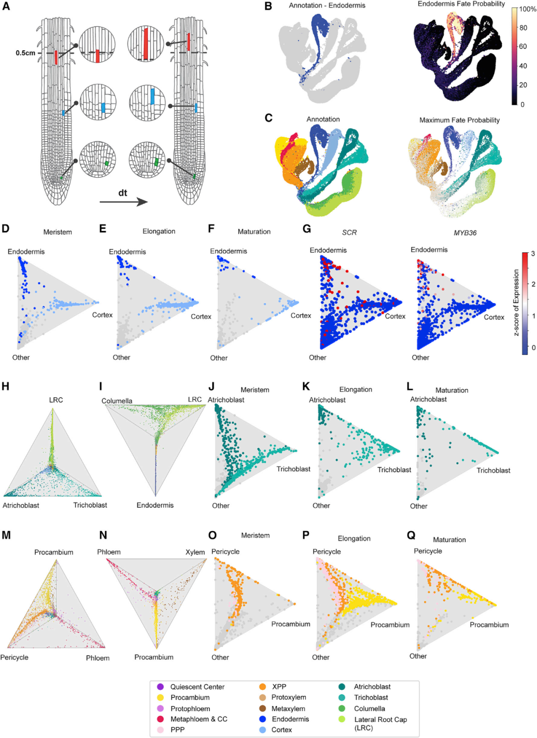 由于擬時序推理表明根細胞類型以不同的速率成熟,于是作者利用基于理想傳輸理論OT(Optimal?Transport)的StationaryOT分析方法來推斷整個圖譜的發(fā)育軌跡。研究人員發(fā)現(xiàn)它可以在很大程度上獨立于圖譜注釋和細胞系分割,來推斷細胞系的發(fā)育軌跡,反映每種細胞和組織類型分化的現(xiàn)有生物學知識。分化事件可以通過將多個命運概率以“三角圖”的形式投影到重心坐標中來實現(xiàn)可視化。作者利用“三角圖”分別展現(xiàn)了分生區(qū)、伸長區(qū)、成熟區(qū)的內皮層和皮層細胞的命運概率(圖4D-F)。已知內皮層標記基因SCARECROW?(SCR)?和MYB36的表達模式與伴隨細胞成熟而不斷增加的內皮層命運概率相一致(圖4G)。之后按照發(fā)育區(qū)對生毛細胞、非生毛細胞(圖4J-L),中柱鞘、原形成層(圖4O-Q)也繪制“三角圖”。此外,理想傳輸理論也有助于識別發(fā)育調節(jié)因子。
