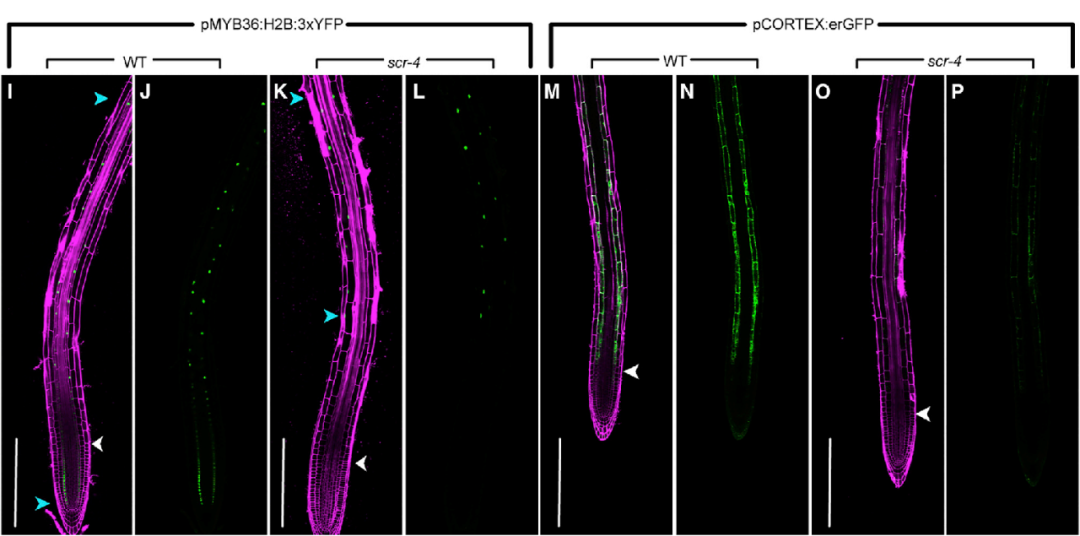 為了在體內進一步對scRNA-seq得到的結論進行驗證,作者驗證了皮層和內皮層標志物的空間表達模式在scr突變層是否會發(fā)生改變。在WT中,內皮層標志基因MYB36和皮層轉錄報告基因AT1G09750?(CORTEX)在它們各自類型的伸長區(qū)表達,MYB36在分生區(qū)的內皮層也表達。但scr突變體中,MYB36轉錄報告基因的表達僅在晚期延伸區(qū)和成熟區(qū)可見,皮層轉錄報告基因在延伸區(qū)和成熟區(qū)都有所減少(圖6-2)。以上結果都與scRNA-seq分析結果一致。