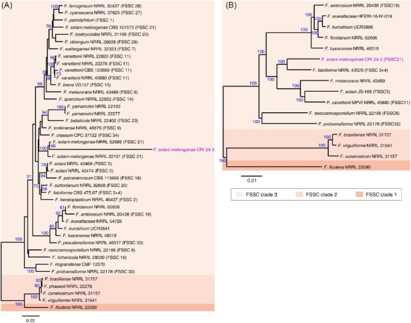 使用 BLASTn 工具與 NCBI 數(shù)據(jù)庫的比對表明,從 CRI 24-3 基因組 DNA 擴增的 ITS 序列 PCR 與F. solani-melongenae?NRRL 22101 具有 99.8% 的同一性,具有 100% 的查詢覆蓋率(未發(fā)表的數(shù)據(jù)),表明 CRI 24-3 是 FSSC 的成員。為了更準確地識別 CRI 24-3,進行了基于ITS、RPB2和TEF 1-α的串聯(lián)序列的信息系統(tǒng)發(fā)育分析(圖 4A)。組合序列樹中的大多數(shù)引導值高于 ITS 樹(未發(fā)布數(shù)據(jù))中的值。三基因座樹顯示了一個優(yōu)勢分支,包括 FSSC 進化枝 3 內(nèi)的 38 個群內(nèi)末端,F(xiàn)SSC 進化枝 1 和 2 內(nèi)的分類群形成了一個基礎(chǔ)姊妹群(圖 4A和表 S2)。由 FSSC 分類群形成的主要分支被分成一個末端節(jié)點,包括 CRI 24-3 和另一個包含F. protoensiforme?(FSSC 32) 和F. riograndense的亞基底節(jié)點。重要的是,CRI 24-3 與F. solani-melongenae密切相關(guān),并聚集在 FSSC 進化枝 3 中。因此,F(xiàn)RST 的分離株 CRI 24-3 被鑒定為F. solani-melongenae?(FSSC 21) ,此方法是基于 Nilsson 等人提出的方法。