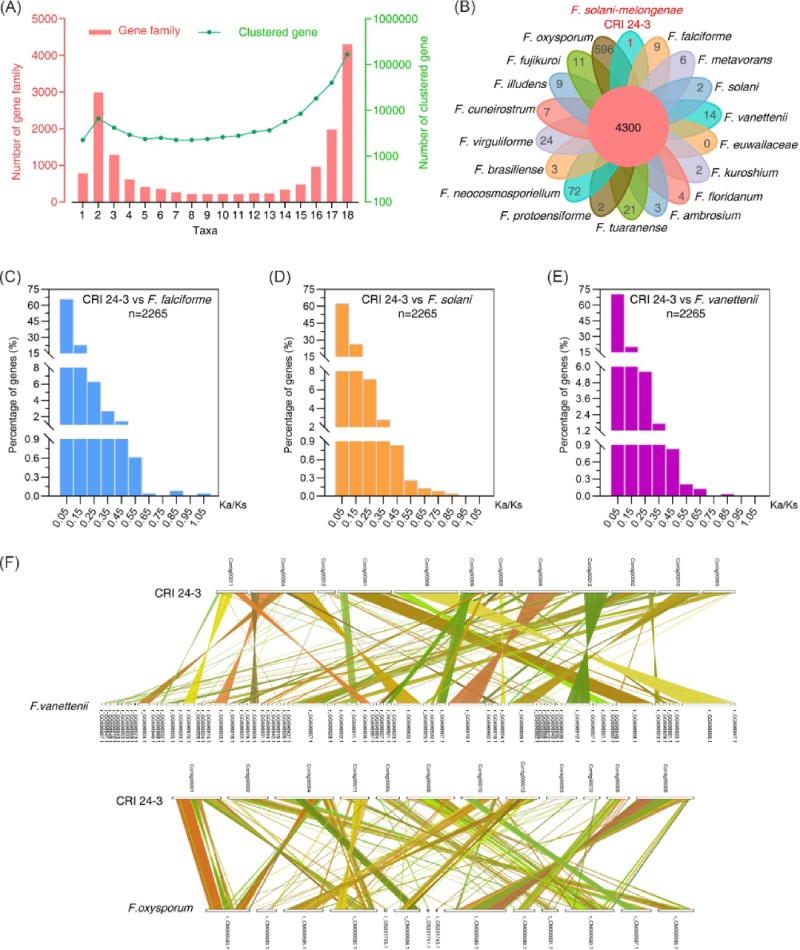 圖6 CRI 24-3與其他鐮刀菌的基因組比較分析。 (A)基因家族和聚集在相應家族中的基因數(shù)量從1到18不等。(B)花形維恩圖。?中心值表示 18 個鐮刀菌屬中所有共有基因家族的數(shù)量;?花瓣的值表示每個物種中特有基因家族的數(shù)量。?(C 到 E)CRI 24-3 和?F. falciforme、F. solani、F. vanettenii?之間基因?qū)Φ?Ka/Ks 比率分布。?小寫字母“n”后面的值表示所有檢測到的基因?qū)Φ臄?shù)量。?(F) 顯示基因組共線性的雙同線性圖。?不同顏色的線用于連接 CRI 24-3 和?F. vanettenii?(頂部) 或?F. oxysporum?(底部) 之間的直系同源基因?qū)Α?/p>