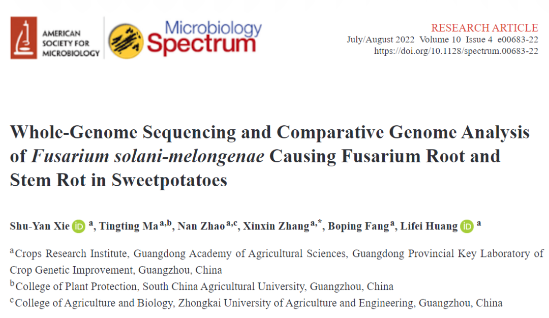 近日, Microbiology Spectrum(IF 9.0431)在線發(fā)表了廣東省農(nóng)科院作物所黃立飛副研究員、房伯平研究員為通訊作者的研究論文 “Whole-Genome Sequencing and Comparative Genome Analysis of?Fusarium solani-melongenae?Causing Fusarium Root and Stem Rot in Sweetpotatoes”,該研究報道了F. solani-melongenae?分離株 CRI 24-3 的全基因組組裝序列,并且深入探討其功能基因信息,為其他密切相關(guān)的鐮刀菌屬物種的基因組研究提供基礎(chǔ),通過比較基因組分析促進了對鐮刀菌基因組特征和進化關(guān)系的整體理解。百邁客有幸參與此項研究工作,對該真菌全基因組進行測序組裝注釋和比較基因組分析。