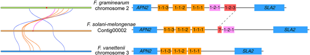其他三種密切相關(guān)的 FSSC 物種F. falciforme、F. solaniF. vanettenii的基因組被用作參考基因組來探索 CRI 24-3 的選擇壓力。分別確定了 CRI 24-3 與?F. falciforme、F. solani?F. vanettenii?之間的 2265、2272 和 2272 直系同源物對的非同義替換率 (Ka) 與同義替換率 (Ks) 的比率( 圖 6C 至 E)。Ka /Ks總體分析的值小于 1,表明 CRI 24-3 中的大多數(shù)直系同源物似乎都經(jīng)過了純化選擇并且高度保守。然而,CRI 24-3 和F. falciforme基因組的比較確定了一個快速進化基因?qū)Γ‥VM0014458.1 與 GE10416_g)的 Ka /Ks比率大于 1,表明陽性選擇可能發(fā)生在進化?;蚪M共線性分析表明,F. vanetteniiF. oxysporum基因組中的幾個染色體片段在 CRI 24-3 中濃縮成一個片段,并有一些倒位(圖 6F )。此外,CRI 24-3 中的一些直系同源物具有多對一的關(guān)系。CRI 24-3 中至少有兩個查詢基因與參考物種中的相同直系同源物匹配。值得注意的是,CRI 24-3 的重要基因組區(qū)域不能與尖孢鐮刀菌基因組中的那些共線性耦合,由 35.9% 的共線性率(共線直系同源物對與所有直系同源物對的比率)支持,該比率低于CRI 24-3 和F. vanettenii?(77.6%)。結(jié)果表明,CRI 24-3在系統(tǒng)發(fā)育上與尖孢鐮刀菌相距較遠。MAT基因座對于在鐮刀菌屬中產(chǎn)生子囊孢子至關(guān)重要。在此,交配型結(jié)構(gòu)組織 ( MAT ) 基因座在基于簡化的共線性分析比較了茄科鐮孢菌CRI 24-3、禾谷鐮刀菌PH-1 和F. vanettenii?77-13-4(圖 7)。與僅攜帶 MAT1-1 基因的?F. vanettenii?77-13-4相比, CRI 24-3 含有MAT1-1和MAT1-2獨特型基因,在單個MAT基因座處與禾谷鐮刀菌密切相關(guān),除了 CRI 24-3 是 MAT1-2-3 缺陷型。只有位于 CRI 24-3 中 MAT1-2-1 上游區(qū)域的沒有任何特征功能域的片段與禾谷鐮刀菌中的 MAT1-2-3 具有序列相似性。