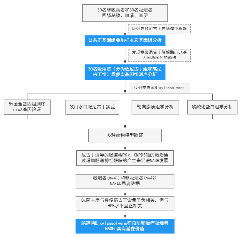 吸煙是人類常見的不健康行為之一,世界衛(wèi)生組織將吸煙列為可預(yù)防死亡的主要原因。戒煙是延長預(yù)期壽命的有效方法,但由于尼古丁的強大成癮性和戒斷癥狀,戒煙并不容易實現(xiàn)。尼古丁降解最近被認為是阻斷尼古丁誘發(fā)的病理的一種策略。NAFLD(非酒精性脂肪肝?。┌瑥V泛的病理,通常從簡單的脂肪變性發(fā)展為 NASH(非酒精性脂肪性肝炎),然后在某些情況下發(fā)展為肝硬化和肝癌。由于腸道產(chǎn)生的代謝物在通過腸-肝軸的 NAFLD 進展中具有關(guān)鍵作用,因此建立腸道尼古丁積累、腸源性代謝物和NAFLD進展之間的關(guān)系可以為吸煙相關(guān)的肝臟疾病提供新的線索。