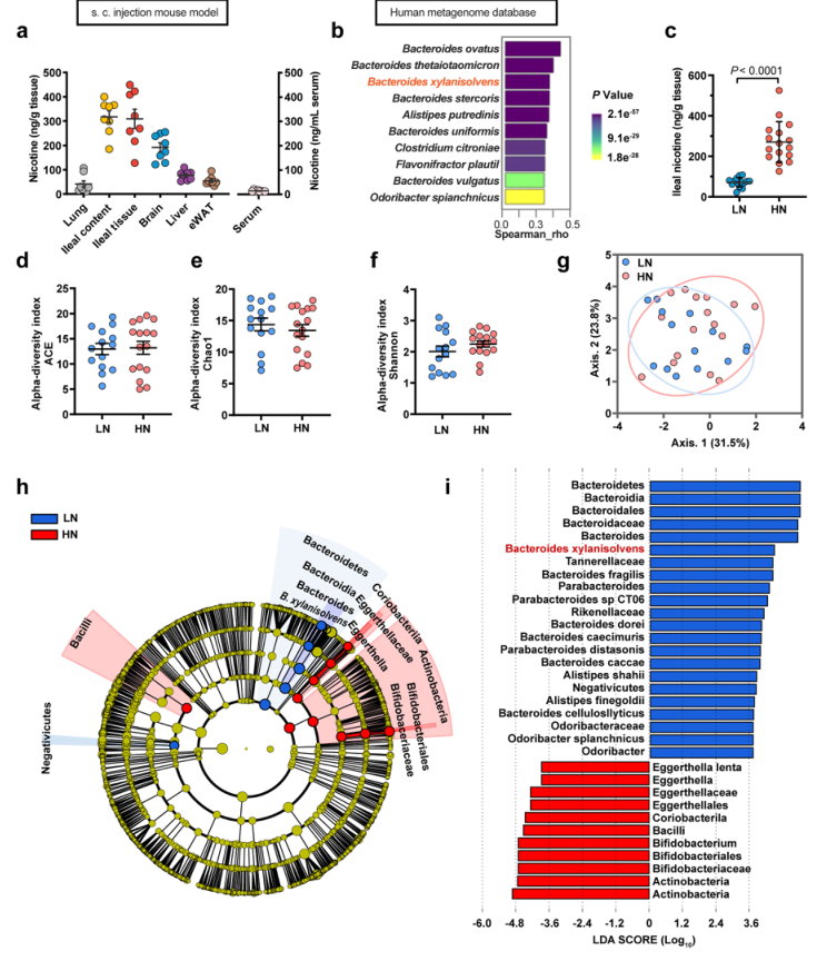 圖 1.鑒定腸道尼古丁積累和腸道細菌介導(dǎo)的的腸道尼古丁降解。