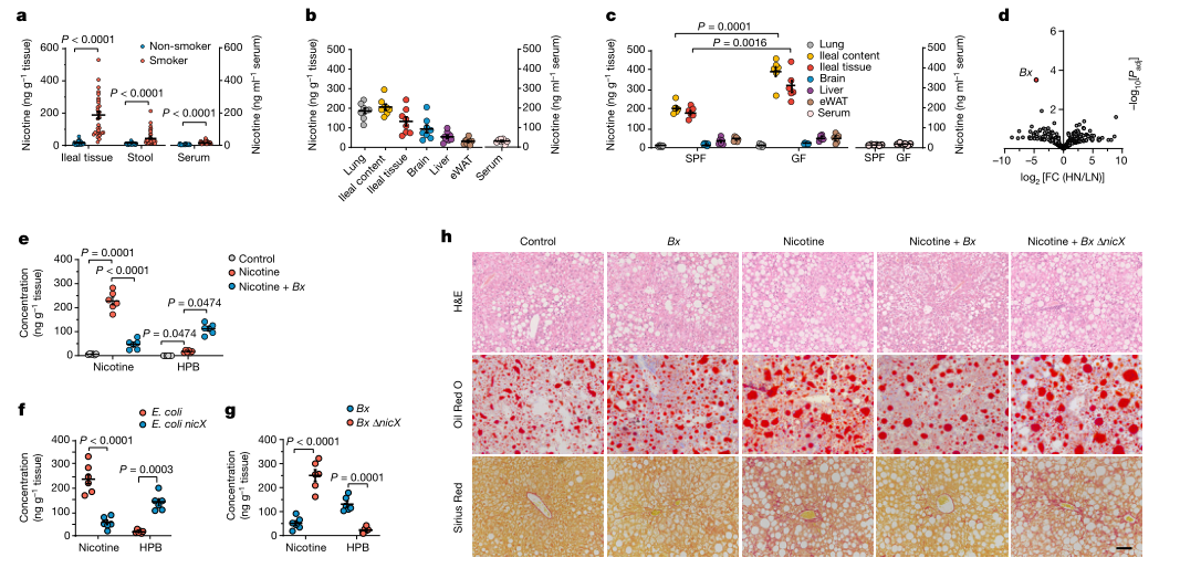 該研究發(fā)現(xiàn)尼古丁在吸煙期間在腸道中積聚并加速NAFLD的進展,但它可以被人類共生菌B. xylanisolvens 有效降解。揭示了了腸道尼古丁積累的病理影響,并確定了一種內(nèi)源性尼古丁降解腸道細菌,該細菌對預(yù)防和治療吸煙者的 NASH 具有潛在價值。