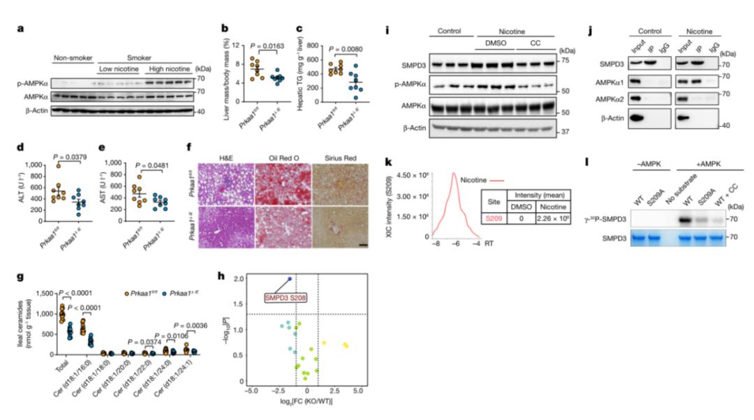 脂質(zhì)被認為在 NAFLD 進展中具有重要作用,因為它們是該病理學(xué)中腸道和肝臟之間串?dāng)_的關(guān)鍵介質(zhì)。研究者進一步對回腸進行了靶向脂質(zhì)組學(xué)分析,并確定神經(jīng)酰胺是導(dǎo)致Prkaa1基因敲除(KO)和對照(WT)腸上皮在尼古丁治療下基于聚集分化的主要代謝物(擴展數(shù)據(jù)圖5n,o)。在尼古丁飲用模型中沒有腸道 AMPKα1 的情況下,回腸神經(jīng)酰胺譜較低(圖 2g)?;谀峁哦★嬘媚P突啬c上皮的磷酸化蛋白質(zhì)組分析(擴展數(shù)據(jù)圖 5p),腸上皮AMPKα1的缺失顯著降低了SMPD3的Ser208位的磷酸化(圖2H和擴展數(shù)據(jù)圖5Q)。