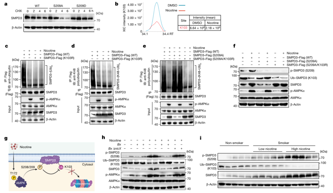 此外,在尼古丁處理的SW480細胞中,SMPD3在Lys103處的去泛素化程度顯著高于DMSO處理的細胞(圖3B和擴展數(shù)據(jù)圖6G)。通過免疫沉淀,我們發(fā)現(xiàn)泛素化的SMPD3(Lys103)主要包含經(jīng)典的Lys48-連接Ub鏈(Lys48-Ub),而不是Lys63-Ub,后者被尼古丁處理減少(圖3C,d和擴展數(shù)據(jù)圖6h)。S209A突變逆轉(zhuǎn)了尼古丁誘導(dǎo)的SMPD3 Lys48-Ub的減少,K103R突變進一步緩解了這一下降(圖3e和擴展數(shù)據(jù)圖6i)。此外,開發(fā)了抗p-SPMD3(S209)和抗Ub-SMPD3(Lys103)抗體(擴展數(shù)據(jù)圖6J,k),并證實尼古丁誘導(dǎo)的總SMPD3蛋白的增加是由于SMPD3磷酸化水平升高,隨后泛素化減少(圖3F)。