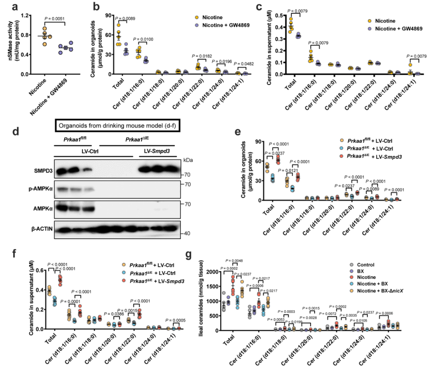 SMPD3被認為是代謝性疾病的病理加速器。將SMPD3抑制劑GW4869應(yīng)用于有機化合物以抑制SMPD3活性。GW4869降低了尼古丁處理下類器官及其上清液中的神經(jīng)酰胺水平。慢病毒表達的SMPD3被用于從尼古丁飲用模型恢復(fù)Prkaa1基因敲除的回腸器官中SMPD3的表達。正如預(yù)期的那樣,SMPD3的過表達逆轉(zhuǎn)了由于回腸器官中AMPKα1缺乏而導(dǎo)致的神經(jīng)酰胺水平的降低。在尼古丁加速的NASH小鼠模型中,在B. xylanisolvens存在的情況下,被B.xylansolvens定植的SPF小鼠回腸神經(jīng)酰胺減少,這是由于腸道p-AMPKα-SMPD3軸被抑制所致。
