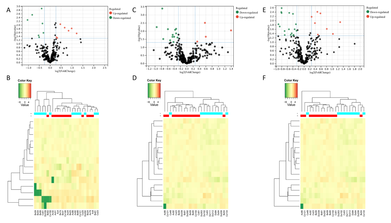 對三組蛋白質(zhì)樣本進行了PCA分析(圖1)。蛋白質(zhì)組差異分析用于分析維生素缺乏對補體差異蛋白的影響。如火山圖(A?vs B)所示,隨著維生素D含量的降低,7種蛋白質(zhì)的表達水平上調(diào),7種蛋白質(zhì)的表達水平下調(diào)(圖2A),如補體因子B(CFB)、原肌球蛋白α-4鏈(TPM4)和可誘導(dǎo)共刺激分子配體(ICOSL)。A組和B組熱圖分析結(jié)果顯示兩組之間有很好的分離(圖2B)。