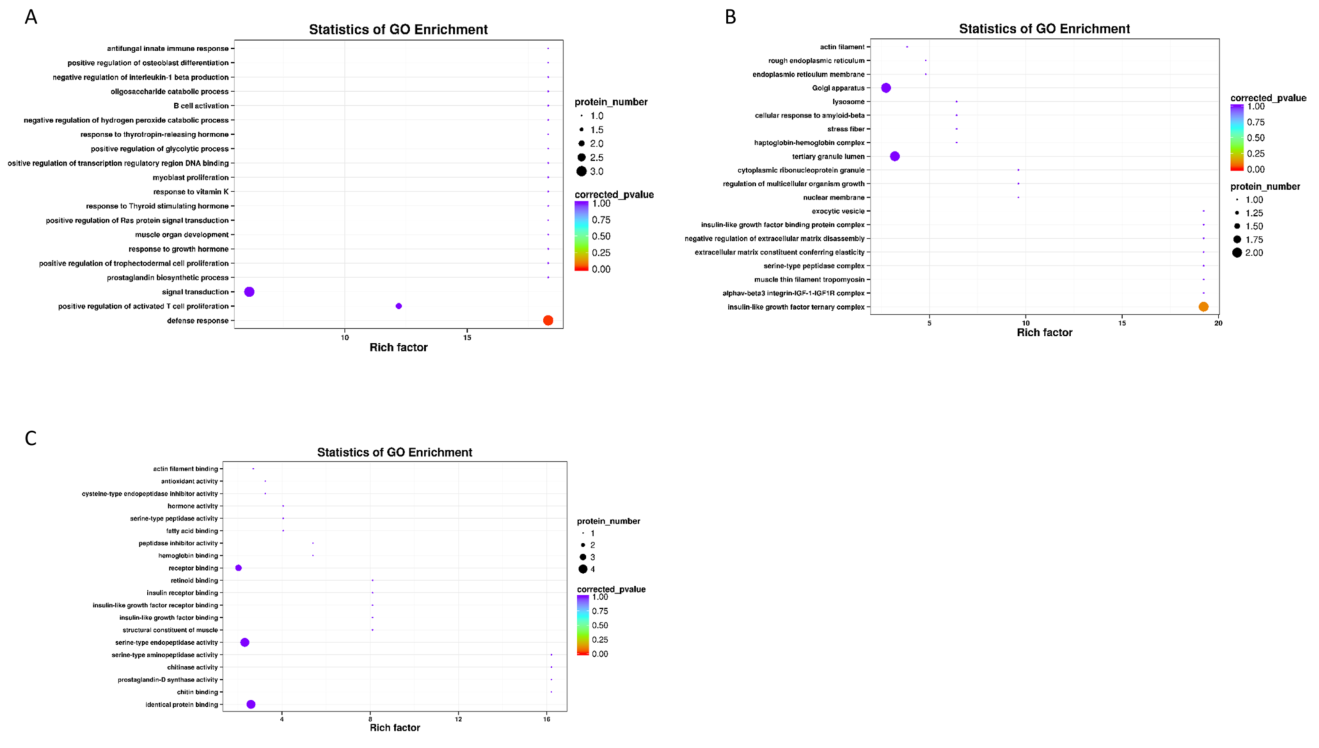 為了進一步探索差異蛋白的潛在功能,我們進行了GO分析。GO功能分析顯示,A組和B組之間差異表達的蛋白質(zhì)主要與“胰島素受體結(jié)合”、“防御反應(yīng)”、“積極調(diào)節(jié)活化的T細胞增殖”和“細胞對淀粉樣β蛋白的反應(yīng)”有關(guān)(圖3)。與C組相比,B組與C組差異表達的蛋白質(zhì)主要集中在“活化T細胞增殖的正向調(diào)節(jié)”、“胰島素樣生長因子結(jié)合蛋白復(fù)合體”和“維生素D結(jié)合”(圖4,見原文)。與C組相比,A組差異表達的蛋白質(zhì)主要集中在“防御反應(yīng)”、“免疫突觸”和“胰島素樣生長因子結(jié)合”(圖5,見原文)。這些結(jié)果表明,差異蛋白廣泛參與免疫功能和胰島素分泌。