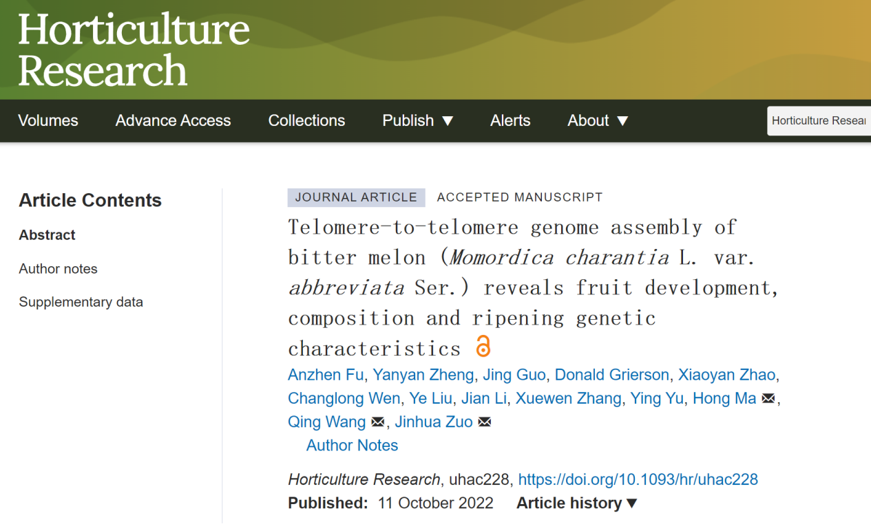 近日,北京市農(nóng)林科學(xué)院農(nóng)產(chǎn)品加工與食品營(yíng)養(yǎng)研究所左進(jìn)華研究員團(tuán)隊(duì)聯(lián)合美國(guó)賓夕法尼亞州立大學(xué)馬紅教授團(tuán)隊(duì)完成超高質(zhì)量苦瓜變種‘金鈴子’T2T基因組。主要研究成果“Telomere-to-telomere genome assembly of bitter melon (Momordica charantia L. var.?abbreviata Ser.) reveals fruit development, composition and ripening genetic characteristics”在線發(fā)表于園藝TOP期刊Horticulture Research。該研究揭示了‘金鈴子’基因組組成和進(jìn)化關(guān)系以及果實(shí)生長(zhǎng)發(fā)育的分子調(diào)控機(jī)制,進(jìn)一步細(xì)化了苦瓜亞種材料差異表型的基因組變異特征,以及果實(shí)品質(zhì)的關(guān)鍵信息。本研究是該團(tuán)隊(duì)在葫蘆科領(lǐng)域的完成的第3個(gè)高質(zhì)量基因組,為葫蘆科系統(tǒng)發(fā)育與應(yīng)用研究起到了重要的推動(dòng)作用。百邁客張學(xué)雯、余瑩作為共同作者,參與了本項(xiàng)研究。