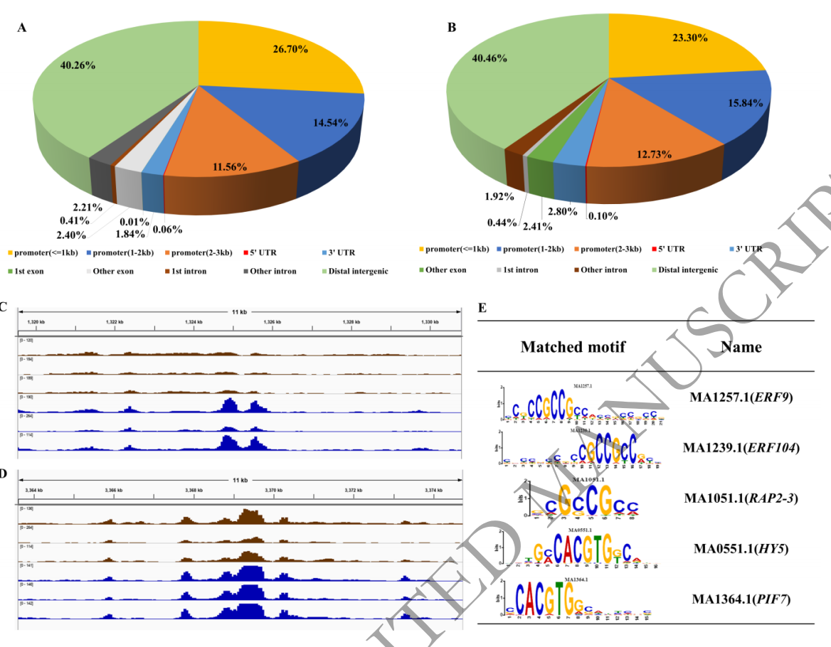 染色質(zhì)的開放區(qū)包含轉(zhuǎn)錄因子結(jié)合位點(diǎn)(TFBS),在轉(zhuǎn)錄因子(TFs)介導(dǎo)的基因表達(dá)調(diào)控中發(fā)揮重要作用。因此,作者通過對(duì)‘金鈴子’三個(gè)時(shí)期的果實(shí)材料進(jìn)行ATAC-seq分析,以確定在生長(zhǎng)過程中差異的染色質(zhì)開放區(qū)域。研究發(fā)現(xiàn),未成熟果實(shí)與破色期果實(shí)中,6號(hào)染色體上存在差異染色質(zhì)開放區(qū),主要是與類胡蘿卜素途徑和植物激素信號(hào)傳導(dǎo)相關(guān)的基因;破色期與成熟期果實(shí)相比,3號(hào)染色體上存在差異染色質(zhì)開放區(qū),主要的影響基因有乙烯應(yīng)答轉(zhuǎn)錄因子WRI1、乙烯應(yīng)答轉(zhuǎn)錄轉(zhuǎn)錄因子ERF118和生長(zhǎng)素應(yīng)答因子1(ARF1)等。