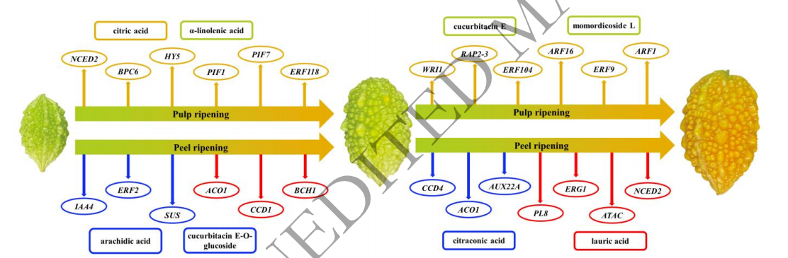 ?為了更全面地了解‘金鈴子’果實(shí)的發(fā)育成熟過程,作者對(duì)‘金鈴子’果實(shí)三個(gè)不同生長(zhǎng)發(fā)育期的轉(zhuǎn)錄組和代謝組進(jìn)行了系統(tǒng)分析。在果實(shí)生長(zhǎng)發(fā)育前期,共鑒定出515個(gè)差異基因和216個(gè)差異代謝物,在果實(shí)生長(zhǎng)發(fā)育后期,鑒定出4593個(gè)差異基因和376個(gè)差異代謝物,這些差異基因和差異代謝物參與調(diào)控‘金鈴子’果實(shí)生長(zhǎng)發(fā)育過程中葫蘆素、皂苷、植物激素、氨基酸、脂類、類胡蘿卜素等的生物合成和代謝過程。這些差異決定了‘金鈴子’果實(shí)的品質(zhì)、營(yíng)養(yǎng)價(jià)值以及果皮顏色的變化,為苦瓜基因組研究提供了一個(gè)新的遺傳資源。