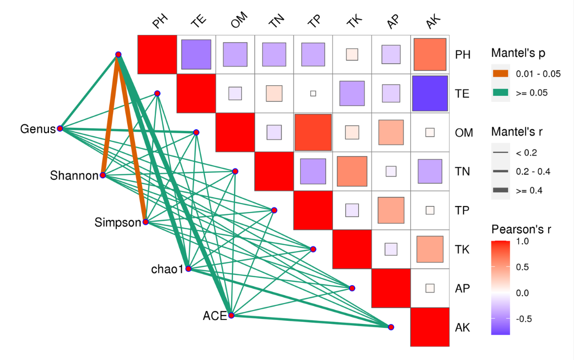 Mantel Test分析:Mantel test 是檢驗(yàn)兩個(gè)矩陣相關(guān)關(guān)系的非參數(shù)統(tǒng)計(jì)方法,多用在生態(tài)學(xué)上,用來檢驗(yàn)群落距離矩陣(如 Bray-Curtis distance matrix)和環(huán)境變量距離矩陣(即環(huán)境因子指標(biāo))之間的相關(guān)性。其可以得到特征與環(huán)境因子之間的mantel test的r值和p值。