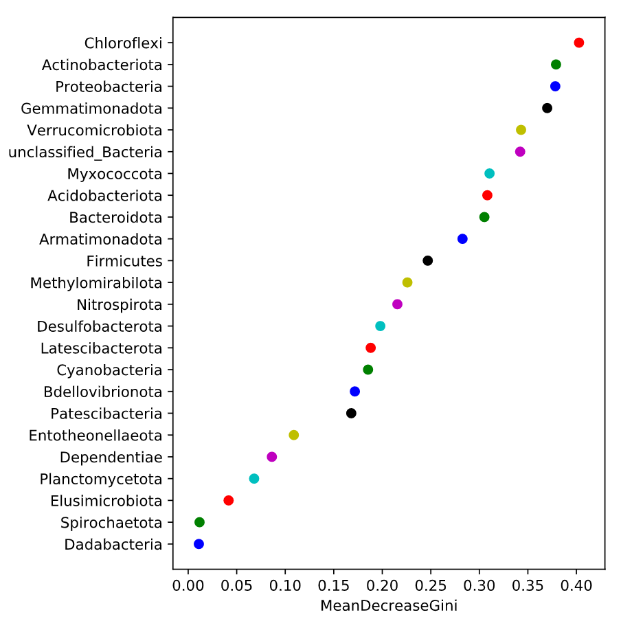 隨機(jī)森林分析:Random forest 分析,隨機(jī)森林指的是利用多棵樹對(duì)樣本進(jìn)行訓(xùn)練并預(yù)測的一種分類器,是機(jī)器學(xué)習(xí)的一種。利用隨機(jī)森林分析可以幫我們找到數(shù)據(jù)中重要的特征:在微生物組中就是哪些微生物組成可以作為特征進(jìn)行各種預(yù)測;另外,隨機(jī)森林可以利用這些重要特征構(gòu)建模型用于分類預(yù)測(分類變量)或者回歸預(yù)測(數(shù)值型變量);隨機(jī)森林分析建議分組內(nèi)樣品至少30個(gè)以上,樣品數(shù)太少影響準(zhǔn)確性。 隨機(jī)森林分析,一般將數(shù)據(jù)劃分為訓(xùn)練數(shù)據(jù)集(train data)和測試數(shù)據(jù)集(test or validate data),訓(xùn)練數(shù)據(jù)集用于構(gòu)建預(yù)測模型,測試集用于查看模型的準(zhǔn)確性。