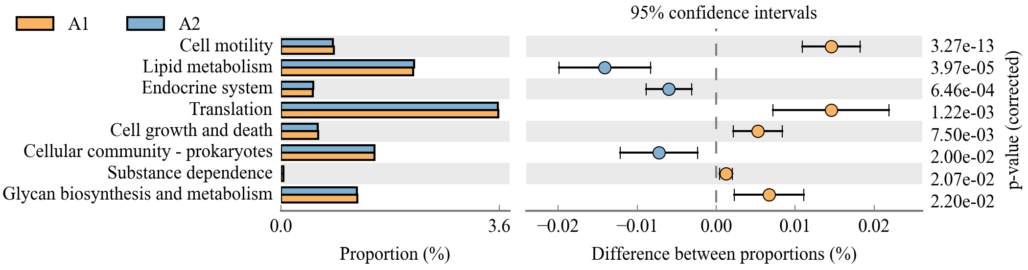 PICRUSt 2 將特征序列(16S rRNA)與微生物基因組數(shù)據(jù)庫(IMG,Integrated Microbial Genomes)參考序列對(duì)齊(aliign)構(gòu)建進(jìn)化樹,找到特征序列的“最近物種”,并根據(jù)已知物種的基因種類和豐度信息預(yù)測未知物種的基因信息,從而結(jié)合基因的KEGG通路信息預(yù)測整個(gè)群落的通路情況。通過組間差異分析,得到在組間具有顯著差異的功能,最后利用Stamp對(duì)結(jié)果進(jìn)行差異可視化。