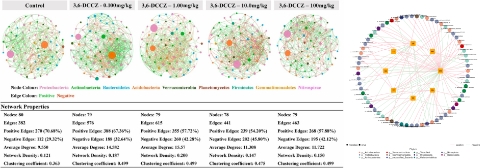 相關(guān)性網(wǎng)絡(luò)分析:網(wǎng)絡(luò)圖是相關(guān)性分析的一種表現(xiàn)形式,根據(jù)各個(gè)物種在各個(gè)樣品中的豐度以及變化情況,進(jìn)行斯皮爾曼(Spearman )秩相關(guān)分析并篩選相應(yīng)條件下的數(shù)據(jù)構(gòu)建相關(guān)性網(wǎng)絡(luò)?;诰W(wǎng)絡(luò)圖的分析,可以獲得物種在環(huán)境樣本中的共存關(guān)系,得到物種在同一環(huán)境下的相互作用的情況及重要的模式信息,進(jìn)一步解釋樣本間表型差異的形成機(jī)制。
