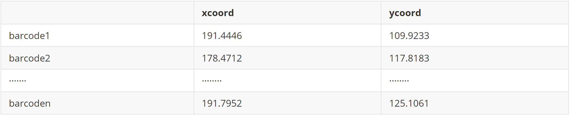 coords?=?read.table(gzfile(‘/xxx/05.AllheStat/BSTViewer_project/subdata/L13_heAuto/barcodes_pos.tsv.gz’), ???header?=?F) %>%?dplyr::rename(barcodes?=?V1, xcoord?=?V2, ycoord?=?V3)