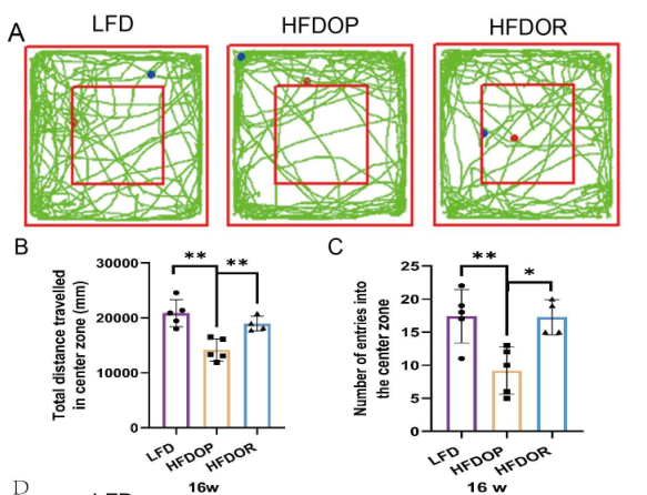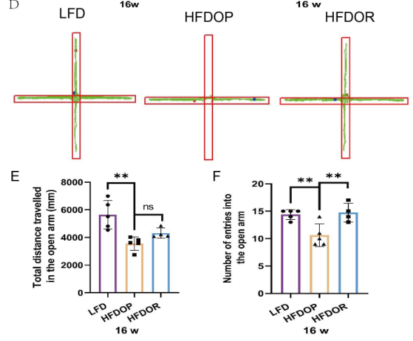 為了排除抑郁和焦慮樣行為對肥胖抵抗的影響,在16周結(jié)束時進(jìn)行了自發(fā)開場活動實(shí)驗(yàn)和高架十字迷宮實(shí)驗(yàn)。開場實(shí)驗(yàn)結(jié)果如圖2A-C所示。HFDOP組進(jìn)入中心區(qū)域的次數(shù)和進(jìn)入該區(qū)域的次數(shù)顯著低于LFD組(圖2B、C)。HFDOR 組比 HFDOP 組更遠(yuǎn)地進(jìn)入中心區(qū)域并且更頻繁地進(jìn)入該區(qū)域(圖2B、C)。高架十字迷宮實(shí)驗(yàn)表明,與LFD組相比,HFDOP組進(jìn)入開臂的次數(shù)和頻率都要少得多(圖3E、F)。HFDOR組比HFDOP組開臂走得更遠(yuǎn),但兩組之間沒有統(tǒng)計學(xué)意義。HFDOR組比HFDOP組更頻繁地進(jìn)入開臂(圖3F)。