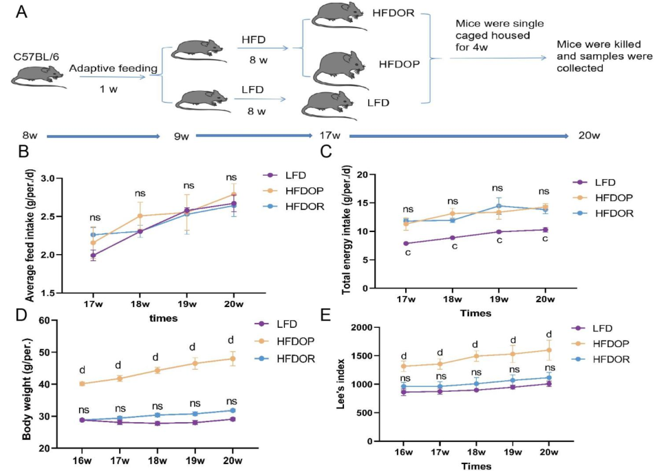高脂飼料喂養(yǎng)8周后,單籠飼養(yǎng)4周,高脂飲食誘發(fā)的肥胖組(HFDOP)小鼠體重和Lee‘s指數(shù)持續(xù)增加,而肥胖抵抗組(HFDOR)小鼠體重和Lee’s指數(shù)持續(xù)增加。然而,HFDOP和HFDOR小鼠的平均每日飼料和能量攝入量沒有顯著差異(圖1B、C)。高脂飲食組與高脂飲食組小鼠體重和Lee‘s指數(shù)有統(tǒng)計學(xué)差異。HFDOP組的空腹血糖水平高于HFDOR組和LFD組(圖1G)。HFDOP組的肝臟重量、總脂肪和總內(nèi)臟脂肪的重量顯著高于LFD組(圖1H-J).