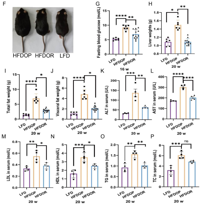 然而,HFDOR組的肝臟、總脂肪和總內(nèi)臟脂肪的重量顯著低于HFDOP組(圖1H-J)。HFDOP組AST、ALT、HDL、LDL、TG和TC水平較LFD組顯著升高(圖3K-P)。然而,HFDOR組的AST、ALT、高密度脂蛋白、低密度脂蛋白和甘油三酯水平顯著低于HFDOP組(圖3K-O)。盡管HFDOR組的TC水平低于HFDOP組,但差異無統(tǒng)計學(xué)意義。