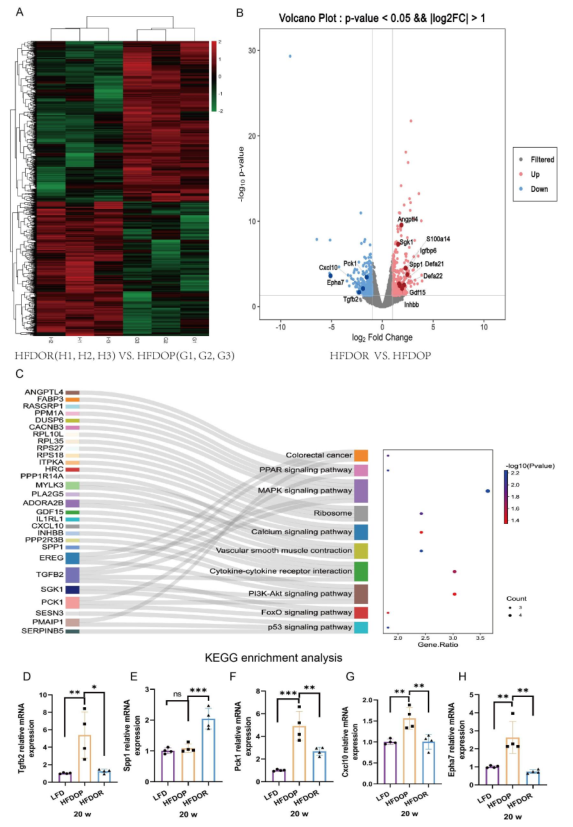 為了進(jìn)一步探討肥胖/肥胖抵抗的原因,研究者運(yùn)用全長轉(zhuǎn)錄組測序技術(shù)檢測空腸組織中的基因轉(zhuǎn)錄水平。共鑒定出1645個差異表達(dá)基因(750個上調(diào),895個下調(diào)),其中331個差異表達(dá)顯著。在331個顯著差異表達(dá)基因中中,有30個基因在11條KEGG通路中被富集。富集的基因和10條最豐富的KEGG途徑如圖所示,這些基因在絲裂原活化蛋白激酶(MAPK)、細(xì)胞因子和磷脂酰肌醇3’激酶/蛋白激酶B(PI3K/Akt)信號通路中顯著豐富(圖6C)。用qPCR分別驗(yàn)證了差異表達(dá)基因。Tgfb2、Spp1、Pck 1、Cxcl10和Epha7表現(xiàn)出一致的mRNA表達(dá)模式(圖6B,D-H)。