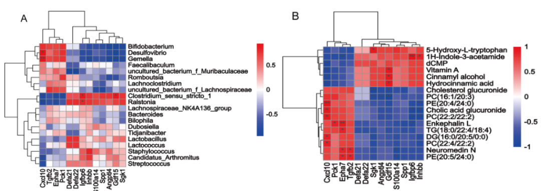 Clostridium_sensu_stricto_1 和 Ralstonia 與 Igfbp6 和 Gdf15 呈正相關(guān),與 Epha7、Pck1和Cxcl10 呈負(fù)相關(guān)。此外,Defa21和Defa22與uncultured_bacterium_f_Muribaculaceae呈負(fù)相關(guān)(圖7A)。DEGs與代謝物的相關(guān)分析結(jié)果表明,H-吲哚-3-乙酰胺與Igfbp6和Inhbb水平呈顯著正相關(guān),與Epha7呈負(fù)相關(guān)。代謝產(chǎn)物5-羥色胺與SGK1呈顯著正相關(guān)。維生素A、肉桂醇和氫肉桂酸與GDF15呈顯著正相關(guān),與CxCl10呈負(fù)相關(guān)。代謝產(chǎn)物PC、PE、TG、DG、腦啡肽L、NeuroMedin N、膽酸葡萄糖醛酸苷和膽固醇葡萄糖醛酸苷與CxCl10、Pck 1、Epha7和Tgfb2呈顯著正相關(guān),與Inhbb、Igfbp6、S100a14、GDF15、ANGPTL4和SGK1呈負(fù)相關(guān)(圖7B)。