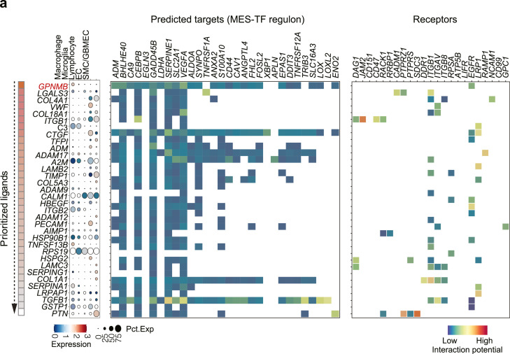 利用NicheNet分析腫瘤微環(huán)境中的細(xì)胞間信號(hào)通訊,鑒定到了多個(gè)基質(zhì)細(xì)胞-腫瘤細(xì)胞相互調(diào)控的配體-受體對(duì),其中預(yù)測(cè)到巨噬細(xì)胞高表達(dá)的GPNMB與大多數(shù)間充質(zhì)靶標(biāo)存在相互作用(圖4a),GPNMB是一種跨膜糖蛋白,最初是在腫瘤細(xì)胞中發(fā)現(xiàn)的,參與腫瘤遷移、侵襲、轉(zhuǎn)移,通過直接抑制T細(xì)胞活化來逃避免疫;Tips:基于個(gè)性化分析結(jié)果,優(yōu)先篩選TOP基因(顯著性、差異倍數(shù)、靶標(biāo)基因數(shù)目等),結(jié)合研究領(lǐng)域內(nèi)已有特定功能報(bào)道的基因或通路,可以幫助更快鎖定目標(biāo)分子。