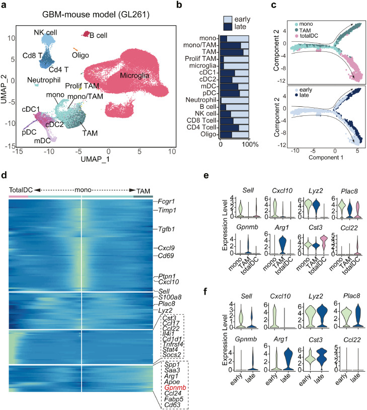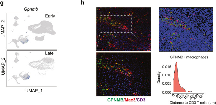 收集小鼠GBM scRNA-seq數(shù)據(jù),重點(diǎn)關(guān)注在早期(d7)和晚期(d28)GBM小鼠的CD45 +免疫細(xì)胞。根據(jù)細(xì)胞maker基因表達(dá)鑒定到了NK cells、Cd8+ T cells、Cd4+ T cells、 B cells、neutrophils、cDC1、cDC2、pDC、mDC、monocytes、TAM、monocytes/TAM、microglia cells(圖5a);與以往的報(bào)道類似,巨噬細(xì)胞隨著腫瘤進(jìn)展急劇侵入腫瘤部位,而小膠質(zhì)細(xì)胞在腫瘤發(fā)展過程中逐漸消失(圖5b);細(xì)胞軌跡分析推斷出樹突狀細(xì)胞和巨噬細(xì)胞起源于單核細(xì)胞,并隨著腫瘤進(jìn)展而逐漸分化(圖5c);不同的通路主導(dǎo)了腫瘤浸潤T細(xì)胞的募集,單核細(xì)胞主要表達(dá)Cxcl10、Cxcl9、樹突狀細(xì)胞特異性表達(dá)Ccl17、Ccl22,而巨噬細(xì)胞表達(dá)Ccl24,Saa3、Arg1和Gpnmb僅在巨噬細(xì)胞中出現(xiàn)(圖5d);在腫瘤發(fā)生過程中,Arg1和Gpnmb的表達(dá)在巨噬細(xì)胞中被強(qiáng)烈誘導(dǎo)(圖5e-g),這與人GBM數(shù)據(jù)集中的發(fā)現(xiàn)一致;然而,Gpnmb敲低后CD206(經(jīng)典M2巨噬細(xì)胞標(biāo)志物)表達(dá)不變,提示GPNMB不是M2巨噬細(xì)胞極化的驅(qū)動(dòng)因素;免疫熒光染色顯示GPNMB+巨噬細(xì)胞與T細(xì)胞共定位(圖5h),表明它們之間存在潛在的相互作用。