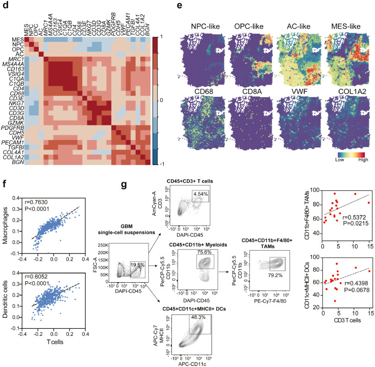 利用反卷積算法對(duì)TCGA數(shù)據(jù)進(jìn)一步進(jìn)行分析,發(fā)現(xiàn)T細(xì)胞豐度與巨噬細(xì)胞、樹突狀細(xì)胞顯著相關(guān),這是兩個(gè)主要的髓系細(xì)胞(圖3f);利用流式細(xì)胞術(shù),分析小鼠GBM中的免疫細(xì)胞,證實(shí)了T細(xì)胞與CD11b + F480 +腫瘤相關(guān)巨噬細(xì)胞(TAM)或CD11c + MHCII + DC顯著正相關(guān)(圖3g)。因此,間充質(zhì)亞型中T細(xì)胞比例較高主要是由于巨噬細(xì)胞的浸潤。