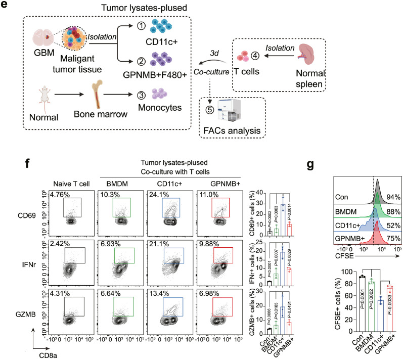 利用CytoTalk算法分析GBM中T細(xì)胞與APC-like細(xì)胞間的相互作用,研究完整的信號(hào)轉(zhuǎn)導(dǎo)途徑,結(jié)果顯示,T細(xì)胞通過Chemokines、cytokines、co-stimulatory/inhibitory、antigen-presentation通路與單核細(xì)胞、Gpnmb-high巨噬細(xì)胞、樹突狀細(xì)胞相互作用,并且DC細(xì)胞與Gpnmb-high巨噬細(xì)胞共享Cxcl16-Cxcr6趨化因子信號(hào)與T細(xì)胞相互作用。為了驗(yàn)證Gpnmb-high巨噬細(xì)胞的調(diào)控機(jī)制,從GBM腫瘤和正常小鼠中提取F4/80 + GPNMB +巨噬細(xì)胞、D11c + DC和骨髓來源的單核細(xì)胞,然后與na?ve T細(xì)胞共培養(yǎng)(圖6e);實(shí)驗(yàn)結(jié)果顯示,與GPNMB+巨噬細(xì)胞和單核細(xì)胞相比,CD11c + DC共培養(yǎng)表達(dá)更高水平的CD69、IFNγ和GZMB,能更好地誘導(dǎo)T細(xì)胞活化(圖6f);T細(xì)胞增殖實(shí)驗(yàn)檢測(cè)結(jié)果也表明,與GPNMB+巨噬細(xì)胞和單核細(xì)胞相比,CD11c + DC能顯著促進(jìn)T細(xì)胞增殖(圖6g)。綜合以上結(jié)果,確定了關(guān)鍵的GPNMB-high巨噬細(xì)胞亞群是GBM細(xì)胞間通訊的樞紐,不僅誘導(dǎo)PN-MES腫瘤細(xì)胞轉(zhuǎn)化,而且通過與DC競(jìng)爭而損害T細(xì)胞激活。Tips:利用細(xì)胞通訊分析篩選潛在細(xì)胞間互作的受體-配體對(duì),結(jié)合細(xì)胞共培養(yǎng)、co-IP和免疫熒光等實(shí)驗(yàn),可以探究目標(biāo)細(xì)胞類型對(duì)特定細(xì)胞功能的影響及機(jī)制。