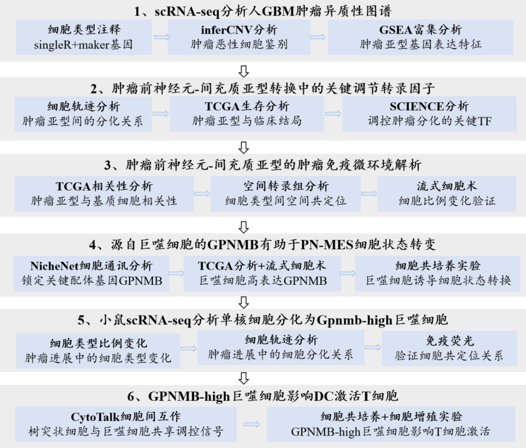 Xiong A, Zhang J, Chen Y, Zhang Y, Yang F. Integrated single-cell transcriptomic analyses reveal that GPNMB-high macrophages promote PN-MES transition and impede T cell activation in GBM. EBioMedicine. 2022;83:104239. doi:10.1016/j.ebiom.2022.104239